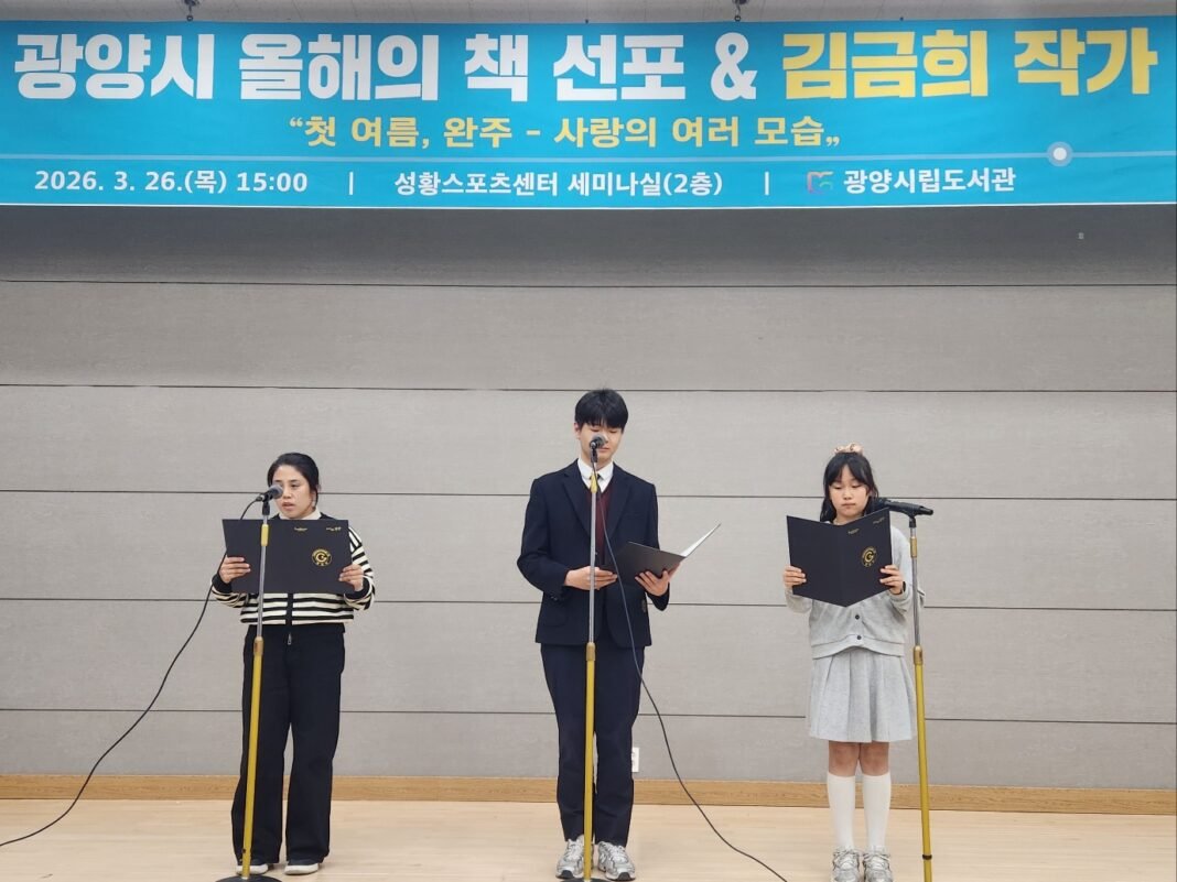 이번 행사는 2026년 광양시 ‘올해의 책’으로 선정된 ▲어린이 도서 『현진에게』(이수진) ▲청소년 도서 『나도 네가 되고 싶어』(송주영) ▲성인 도서 『첫 여름, 완주』(김금희) 등 3권을 시민에게 소개하고, 공식 선포와 함께 작가 강연을 진행하는 자리로 마련됐다.