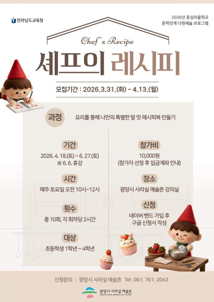 사라실예술촌(촌장 조주현)은 3월 31일부터 4월 13일까지 ‘2026 중심마을학교’ 사업의 일환으로 문학, 예술, 요리를 결합한 다원예술 프로그램 ‘셰프의 레시피’ 참여자를 모집한다.
