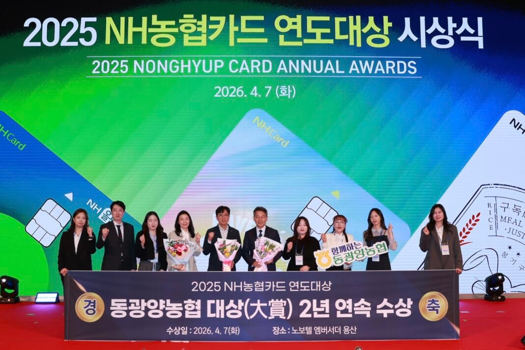 동광양농협(조합장 이돈성)은 지난 7일 서울 용산구 노보텔 앰버서더에서 열린 ‘2025 NH농협카드 연도대상’ 시상식에서 최고상인 대상을 수상하며 2년 연속 수상의 영예를 안았다고 밝혔다.