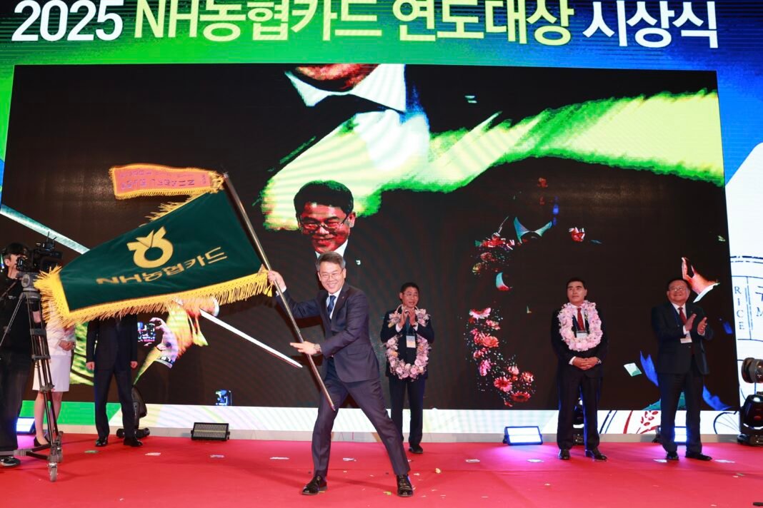 동광양농협 이돈성조합장이 지난 7일 서울 용산구 노보텔 앰버서더에서 열린 ‘2025 NH농협카드 연도대상 대상 수상후 대상 깃발을 힘차게 흔들고 있다. 사진=동광양농협