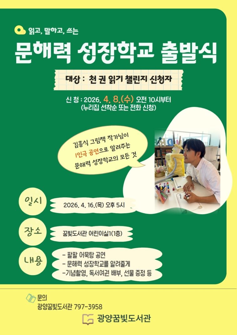 4월 16일 광양시립도서관에 따르면, 오는 16일 오후 5시 광양꿈빛도서관 어린이실에서 ‘문해력 성장학교 출발식’이 열린다. 이번 사업은 디지털 이용 증가로 인한 어린이 독서 시간 감소와 문해력 저하 문제를 보완하기 위해 마련됐다.