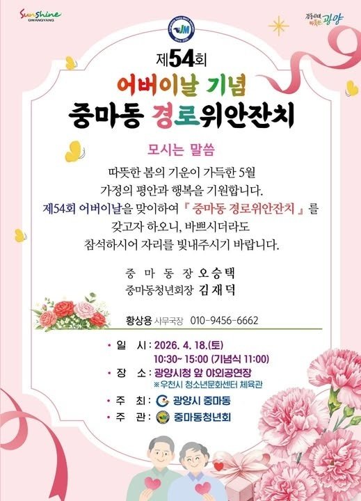 광양시와 중마동이 주최하고 중마동청년회(회장 김재덕)가 주관한 이번 행사는 지역 청년들이 주도적으로 참여해 어르신들께 공경과 감사의 마음을 전하고, 점차 희박해져 가는 경로효친의 가치를 되새기기 위해 마련됐다.