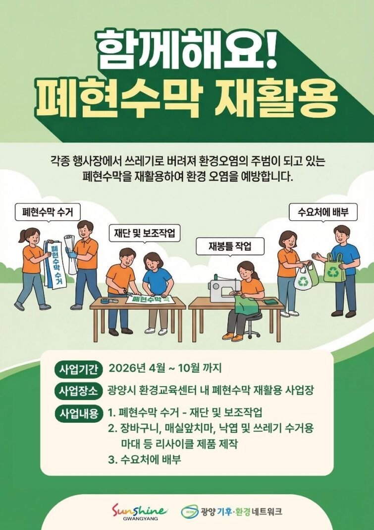 사단법인 광양기후환경네트워크는 이달부터 오는 10월까지 ‘2026년 폐현수막 재활용 사업’을 본격 추진한다. 광양시 환경교육센터 내 전용 사업장에서 진행되는 이번 사업은 폐현수막을 창의적인 생활용품으로 업사이클링(Up-cycling)해 새로운 가치를 부여하는 데 목적이 있다.