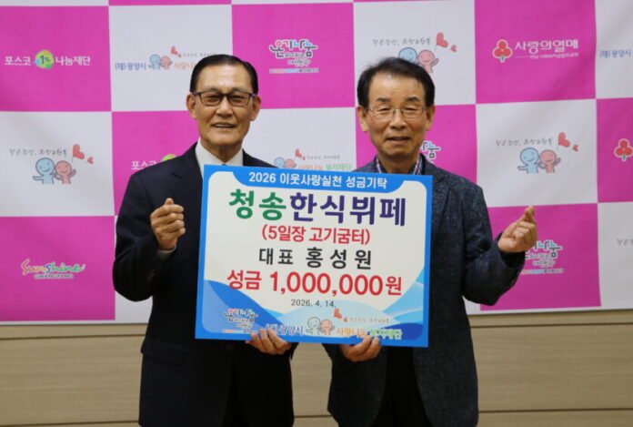 청송한식뷔페는 지난 14일 ‘광양시사랑나눔복지재단'(이사장 김재경)을 방문해 지역사회 나눔실천의 일환으로 성금 100만 원을 전달했다.