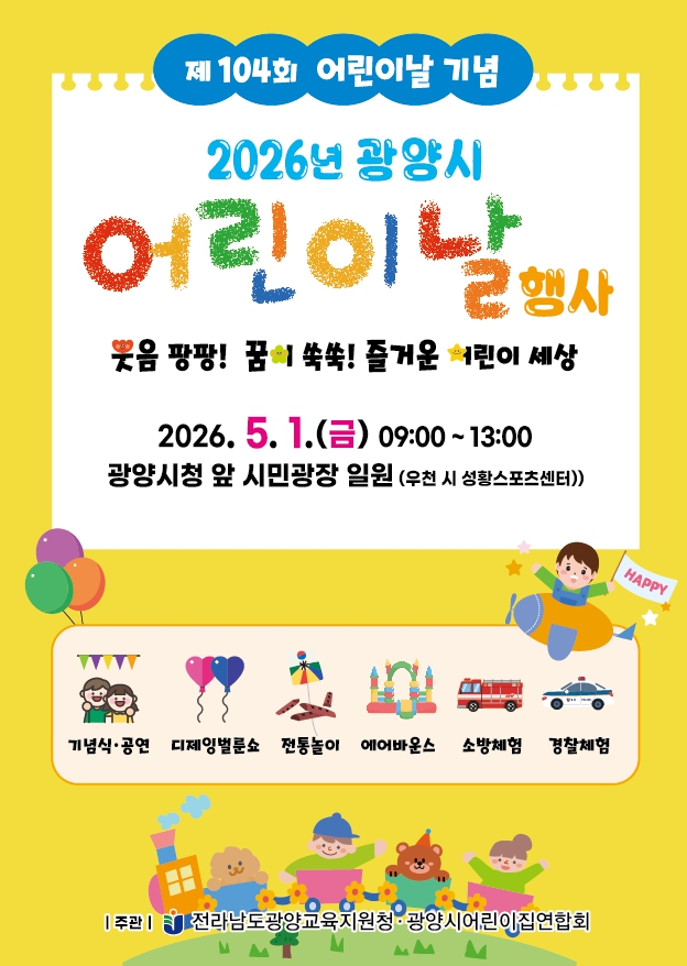 27일 광양시에 따르면, 시는 오는 5월 1일 광양시민광장에서 ‘2026년 광양시 어린이날 행사’를 개최한다. 전라남도광양교육지원청과 광양시어린이집연합회가 공동 주관하는 이번 행사는 어린이 사물놀이, 태권도 시범공연, 시립소년소녀합창단의 식전 공연으로 화려한 막을 올린다.