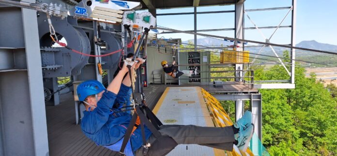 섬진강 별빛 스카이 짚와이어에서 탑승 후 하강 직전의 순간. 사진=김대현