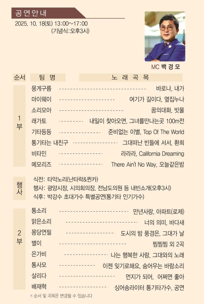 박강수는 대표곡 ‘부족한 사랑’, ‘가을은 참 예쁘다’로 관객과 소통하며 따뜻한 감성을 전할 예정이고, 배재혁은 싱어송라이터로서 진정성 있는 무대를 통해 통기타 음악의 깊이를 선사한다. 또한 ‘별이’ 밴드는 감각적인 크로스오버 음악으로 젊은 감성과 완성도 높은 사운드를 선보인다.