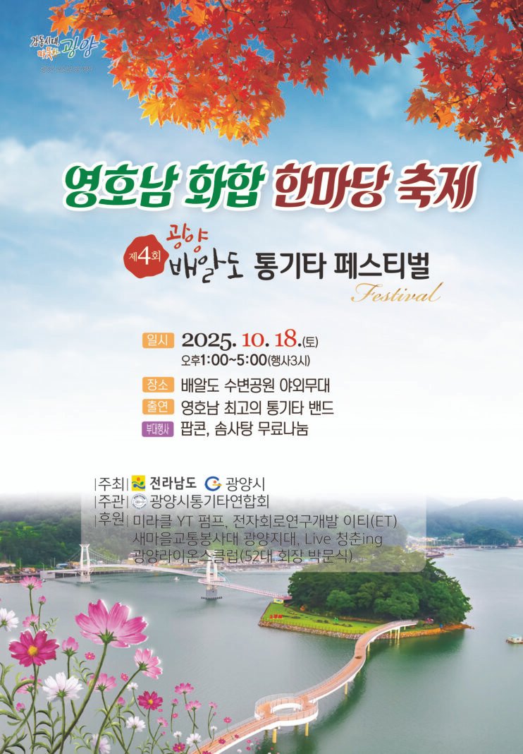 광양시통기타연합회 관계자는 “배알도의 아름다운 풍경과 통기타 음악이 어우러져 세대를 넘어 공감할 수 있는 무대가 될 것”이라며 “음악을 매개로 영호남이 진정으로 하나 되는 축제로 발전시키겠다”고 말했다.