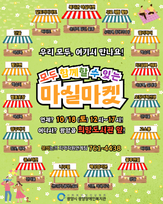 광양시 광양장애인복지관(관장 이준재)은 오는 10월 18일 낮 12시부터 오후 5시까지 광양읍 희망도서관 앞마당에서 ‘모두 함께할 수 있는 마실마켓’을 개최한다.