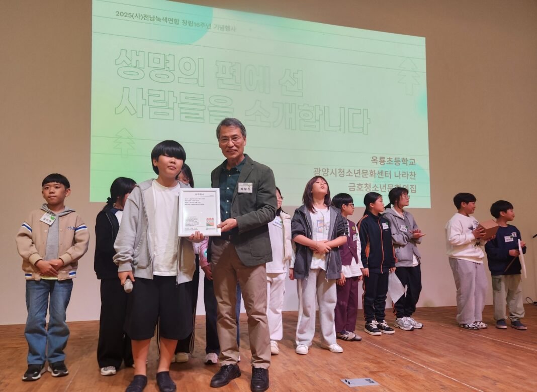 순천대 박성훈 교수는 식전 축하 공연으로 자연과 생명을 가치를 높이는 노래를 기타 연주와 함께 불러 행사장 분위기를 들뜨게 했다. 사진=정경환(사)전남녹색연합 박발진 공동대표는 창립행사에 참여해 준 회원과 후원자들에게 감사 인사를 하면서 “섬진강 두꺼비 내집 마련 프로젝트는 섬진강의 생태문화유산 보호와 보전의 의미가 있어 매우 중요하다”고 말했다. 사진=정경환권향엽 국회의원은 “개발과 성장 과정에서 야생동물 서식지 훼손과 생태계 복원 및 보호 활동은 큰 의미가 있다”며 “전남녹색연합에서 하천과 갯벌을 지키며 우리 지역 공동체를 살려온 활동을 격려한다”고 말했다. 사진=정경환두꺼비 서식지 복원에 기부로 참여한 《생명의 편에 선 사람들》옥룡초등학교 5학년 어린이, 광양YMCA 방과후 아카데미 나라찬 어린이들과, 금호 청소년 문화의집 어린이들의 나눔장터 수익금 기부 내용과 소감을 나누고 후원증서를 전했다. 박발진 공동대표가 광양YMCA 방과후 아카데미 나라찬 어린이와 기념촬영. 사진=정경환전남녹색연합 박미선 팀장은 세풍습지를 습지로 정식 등록을 추진하고, 내년 지방 선거에 대비해 기후환경정책을 발굴하여 지방선거 출마자들이 공약에 반영토록 하는 2026년 녹색비전을 선포하였다. 2026비전 발표를 하고 있는 전남녹색연합 박미선 팀장(왼쪽), 박수완 사무처장(중앙), 윤두나 활동가. 사진=정경환행사장 입구 로비에선 두꺼비 서식지 복원을 위한 1평 기부자 접수와 에코 백 프린팅 체험과 포토 존에서 기념촬영 등 다양한 이벤트가 열렸다. 포토 존에서 기념촬영. 왼쪽부터 안영현 광양시의원, 박발진 전남녹색연합 공동대표, 권향엽 국회의원, 박수완 전남녹색연합 사무처장. 사진=정경환