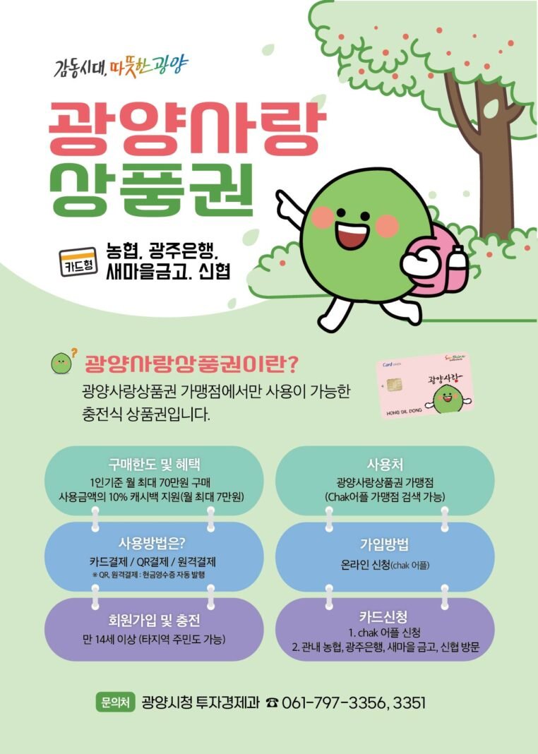 광양시는 2022년 전남 최초로 모바일 상품권을 도입해 시민 편의성을 높였고, 올해는 경기침체로 어려움을 겪는 소상공인과 자영업자의 매출 회복을 지원하기 위해 지난해보다 300억 원 늘어난 1000억 원 규모로 상품권을 발행했다.