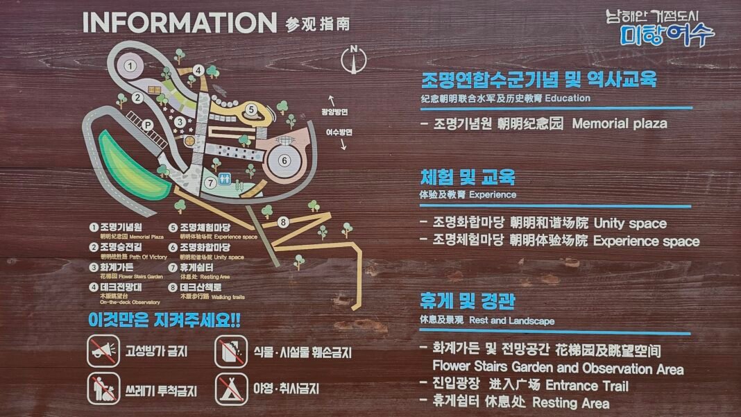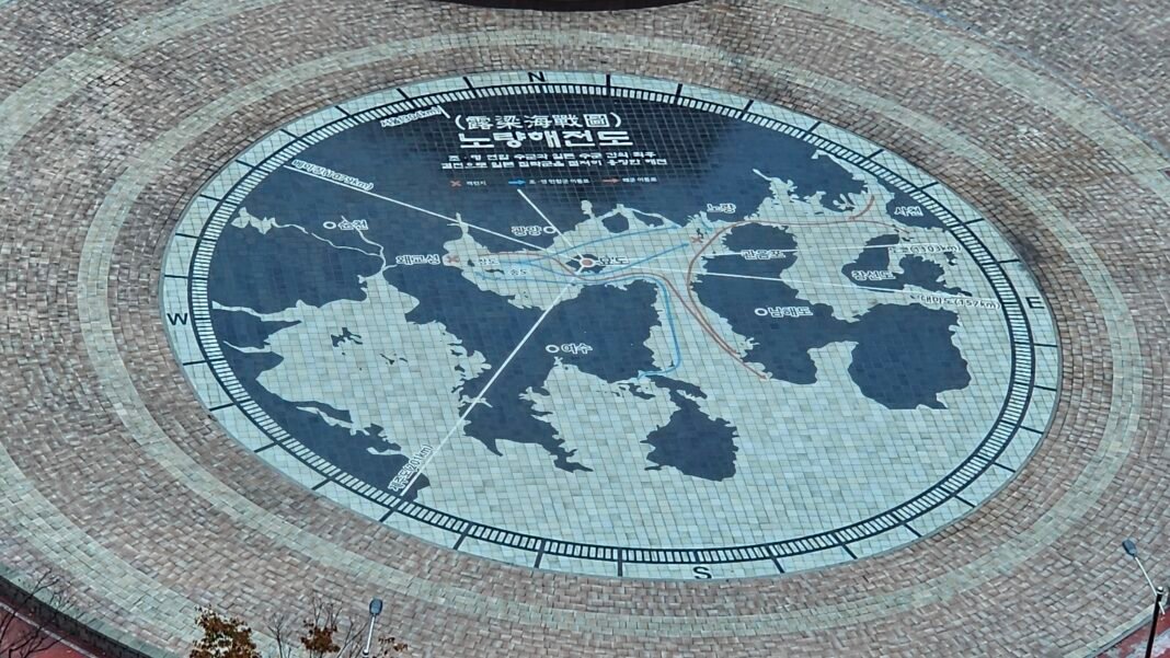이순신대교 홍보관 옆에는 조명연합수군 역사공원이 조성돼 있다. 이곳은 정유재란 당시 조선과 명나라 수군이 힘을 합쳐 일본군을 몰아낸 조명연합전을 기념하는 공간이다. 홍보관에서 나와 산책로를 따라 걸어갈 수도 있고, 차로 이동도 가능하다. 산책로로 내려가다 보면, 공원 바닥에 새겨진 커다란 노량해전도를 만나게 된다.