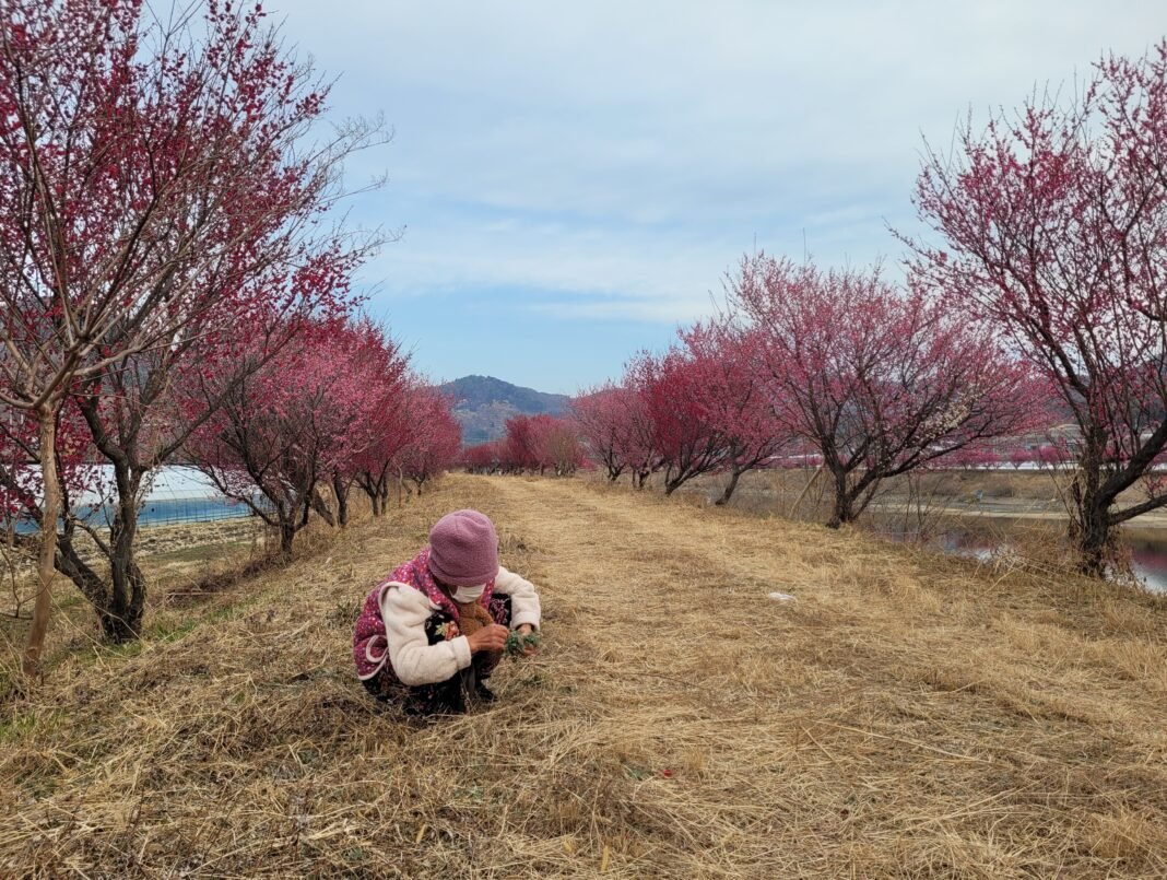 붉게 물든 수어천 둑방길 아래로 봄이 찾아왔다. 7일 열린 ‘제1회 진상면 수어천 홍매화길 걷기 행사’ 구간에서 한 주민이 화사하게 피어난 홍매화 사이로 봄나물을 캐며 고향의 정취를 만끽하고 있다. 사진=이호선